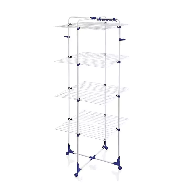 رف تجفيف قابل للطي مع امتداد علوي لتجفيف الأغطية والمناشف والملابس الطويلة، وتصميم يسمح بتجفيف سريع دون إعاقة الطبقات السفلية.