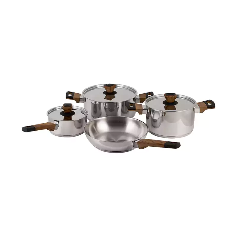 طقم أواني أساسي بسطح غير لاصق وقاعدة متينة لتوزيع الحرارة، مناسب للمطابخ الحديثة وسهل التخزين.